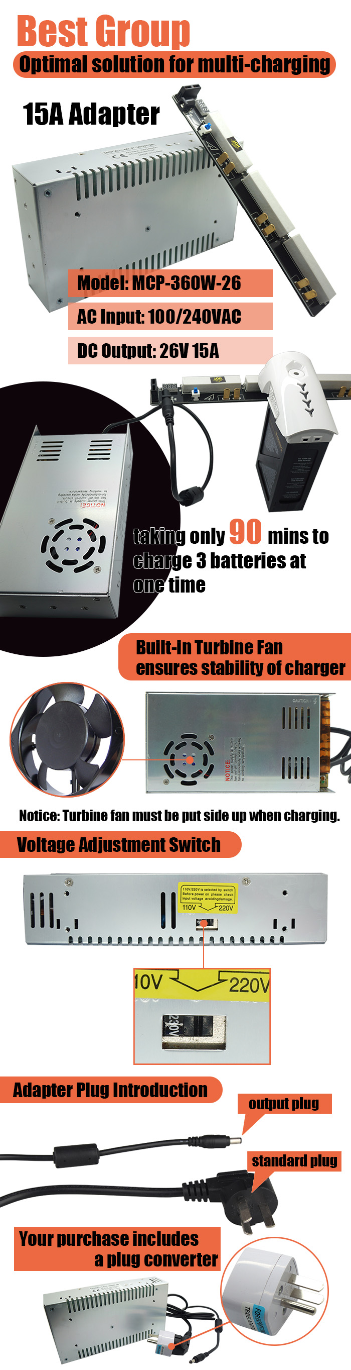 - Parallel charging board simplifies the procedure of charging batteries. You can just throw all 3 batteries on charge while sleeping.